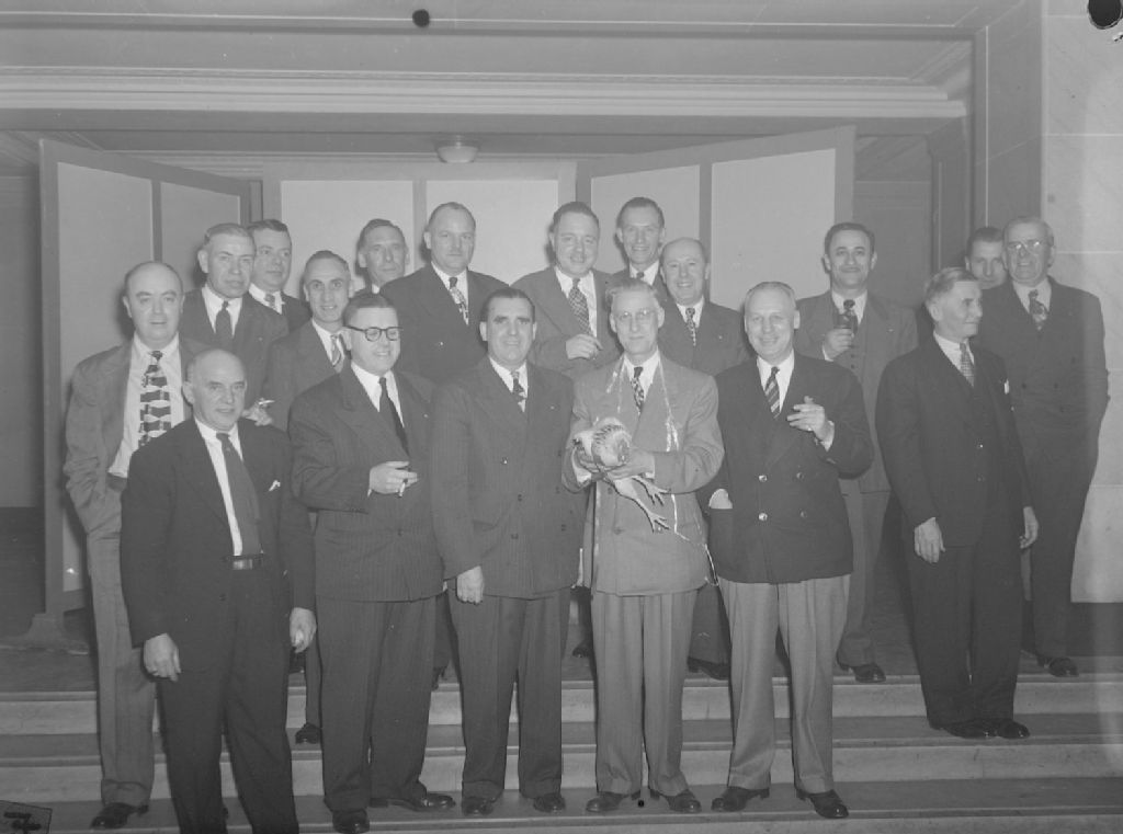 Nous voyons un groupe d'hommes au Masonic Memorial Temple Corp de la rue Sherbrooke Ouest à Montréal. L'un d'eux tient un coq
