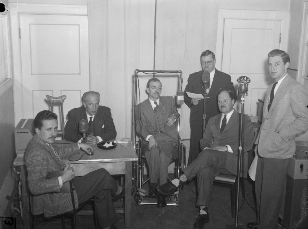 Nous voyons des hommes dans un studio d'enregistrement de CJAD, une station de radio de Montréal. Nous comptons quatre microphones dans la pièce