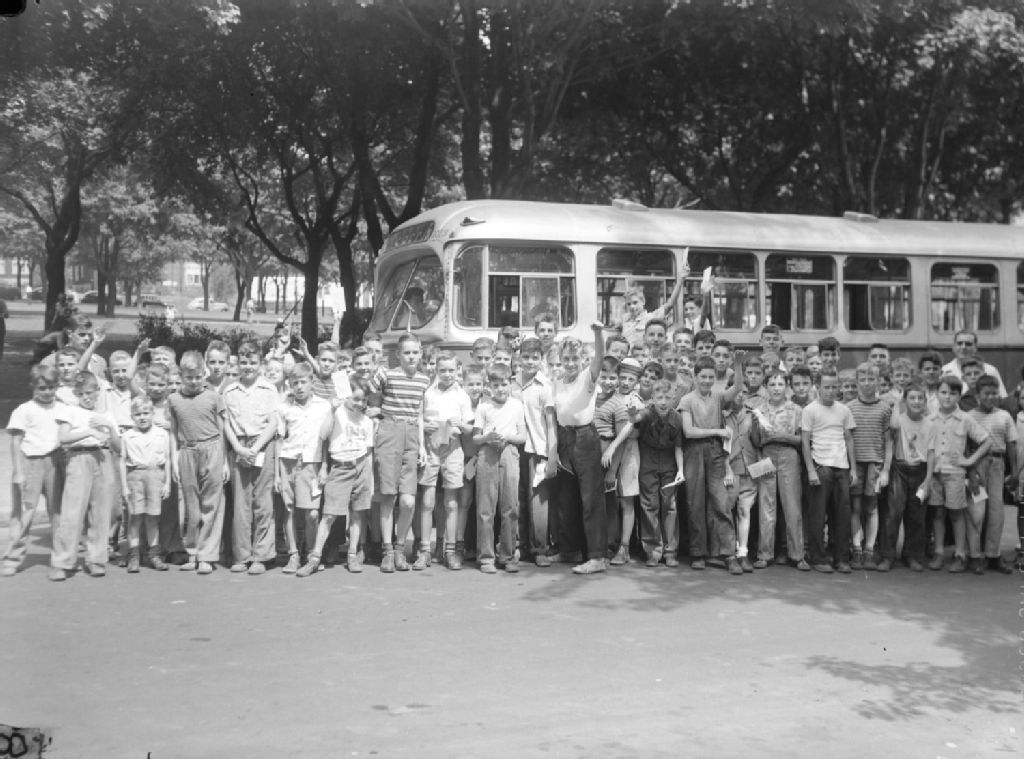 Nous voyons de nombreux jeunes près de l'autobus qui les a conduits au parc Belmont de Cartierville