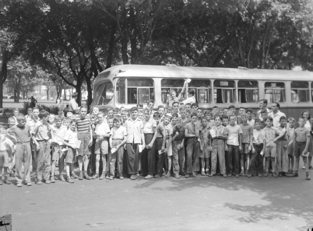 Nous voyons de nombreux jeunes près de l'autobus qui les a conduits au parc Belmont de Cartierville