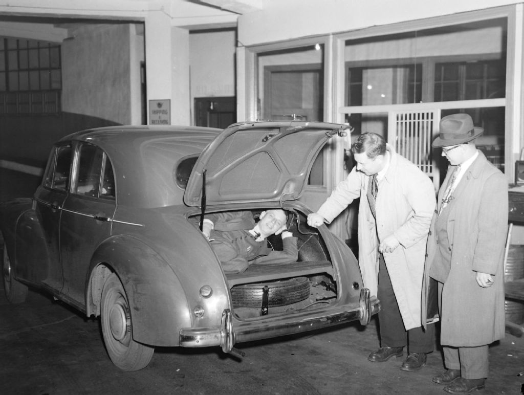 Le vendeur de Toledo Motors, situé rue Sainte-Catherine Ouest à Montréal, se couche dans le coffre de la voiture pour en montrer la dimension aux acheteurs