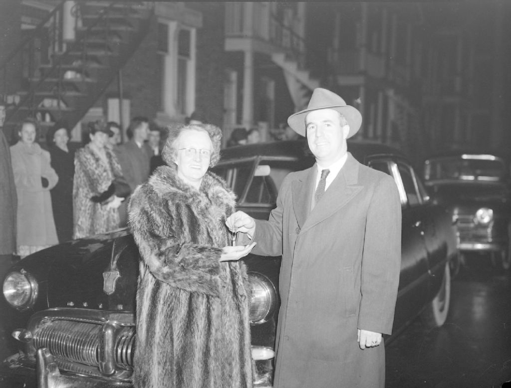 La gagnante de la voiture de la loterie de la Légion canadienne, en manteau de fourrure, reçoit les clés d'un organisateur
