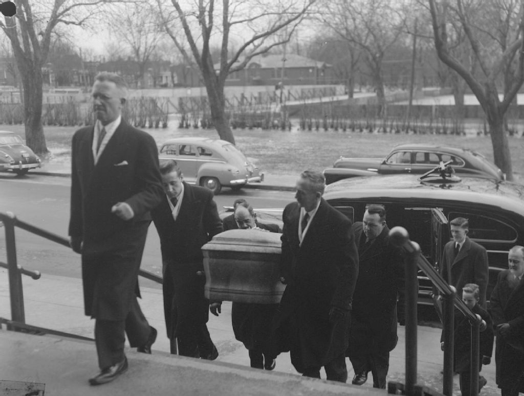 L'ordonnateur des pompes funèbres précède les porteurs du cerceuil d'une jeune fille du quartier Notre-Dame-de-Grâce à Montréal dans les marches menant au lieu des funérailles