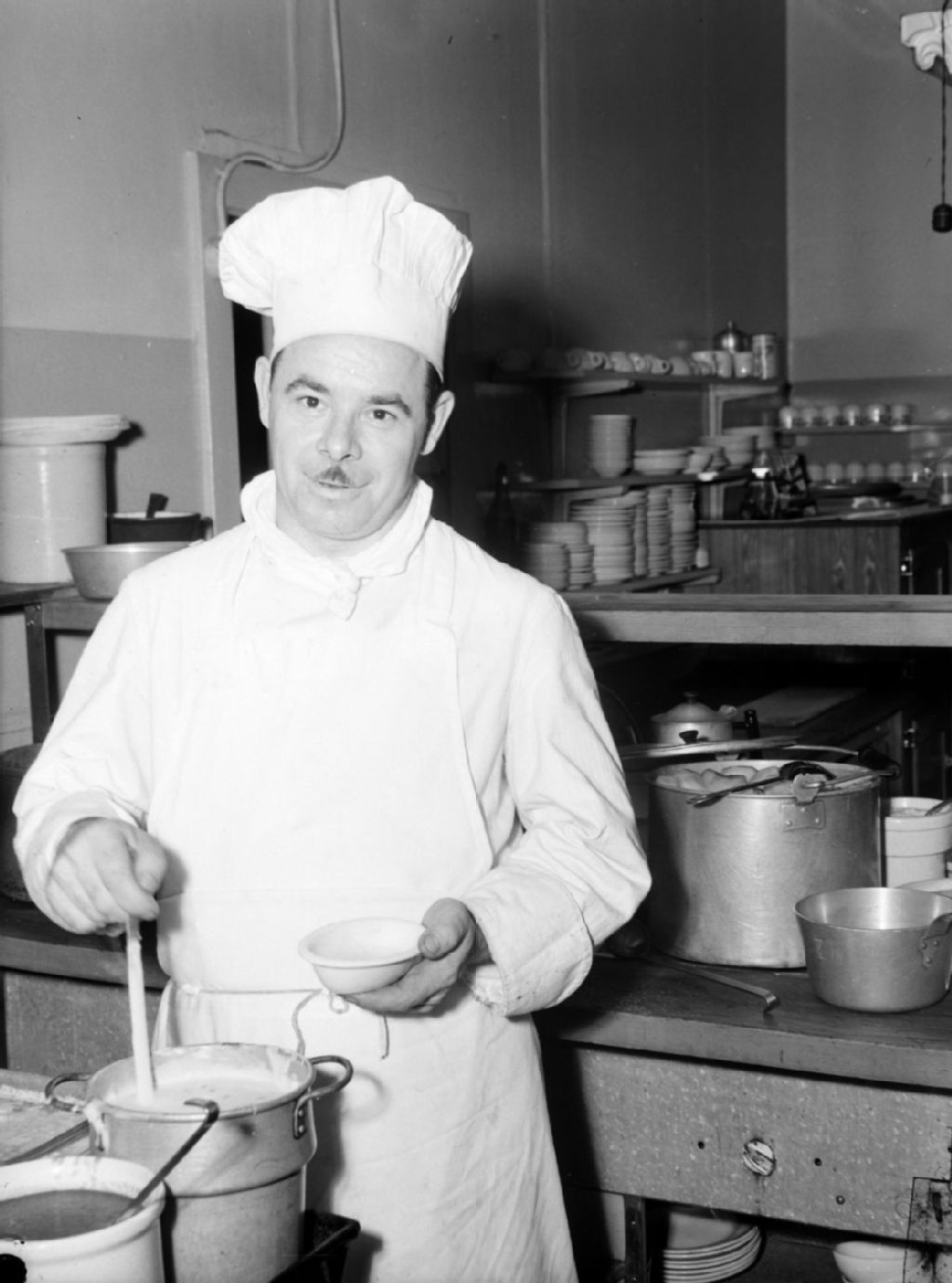 Le chef Monsieur Carlos, dans la cuisine d'un restaurant, tient une louche d'une main et un bol de l'autre. Il est coiffé d'une toque