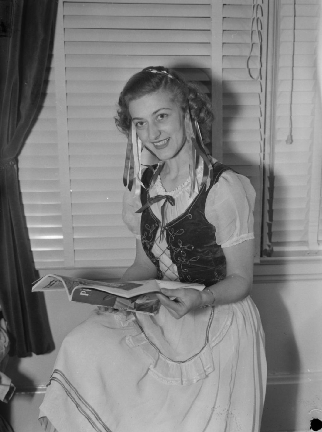 Inga Jewel tient une revue. Elle a des rubans dans les cheveux et porte un boléro brodé
