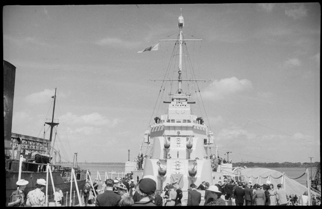 Nous voyons le navire de guerre «H M S Apollo» en rade dans le port de Montréal. Nous apercevons des visiteurs en tenue civile sur le pont, de même que la tourelle principale du vaisseau avec ses multiples canons