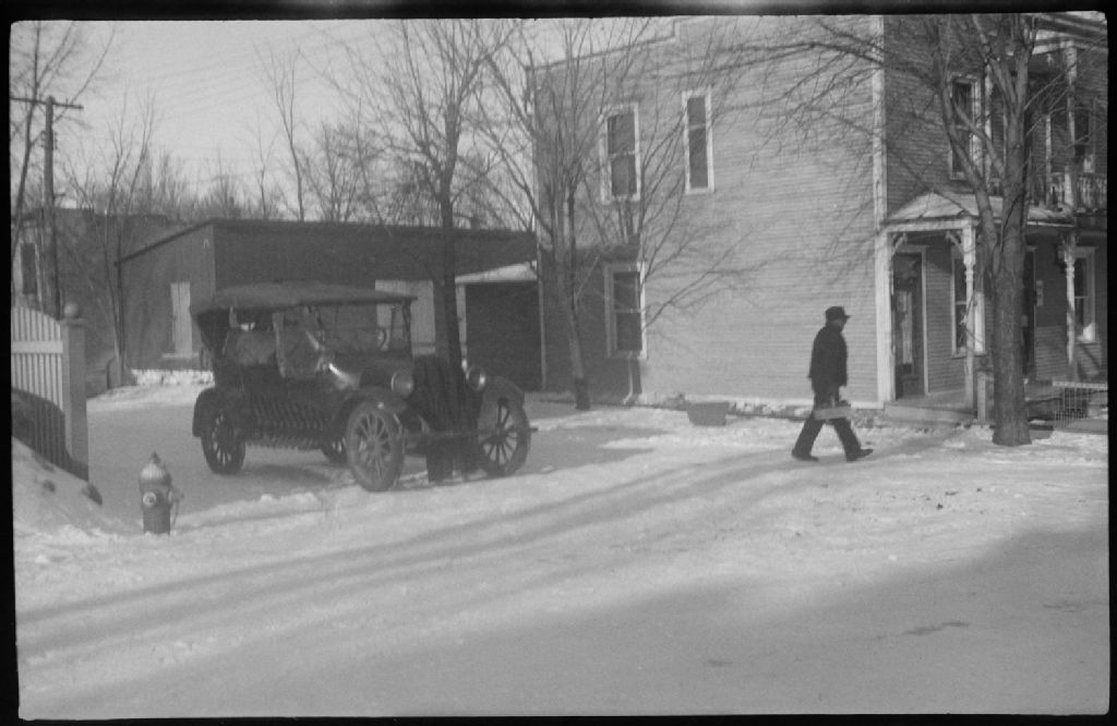Nous voyons un marchand ambulant de fruits, circulant avec son panier dans une rue de la municipalité de Laval-des-Rapides. Nous apercevons des maisons et une automobile