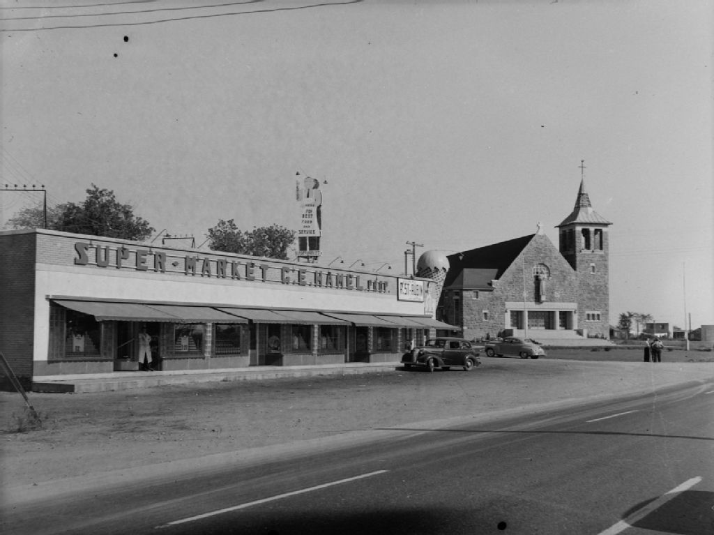 Nous voyons le supermarché G. E. Hamel, la laiterie A. Saint-Aubin et une église de pierres à Saint-Jérôme