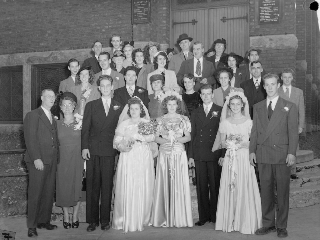 Les nouveaux mariés, Jean Brundle et son mari, sont avec leurs invités devant l'Église du Rédempteur, église anglicane française de la rue Sherbrooke Est à Montréal