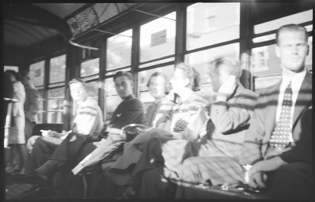 Nous voyons un groupe de passagers en tenue de ville, assis dans un véhicule de transport en commun (tramway)