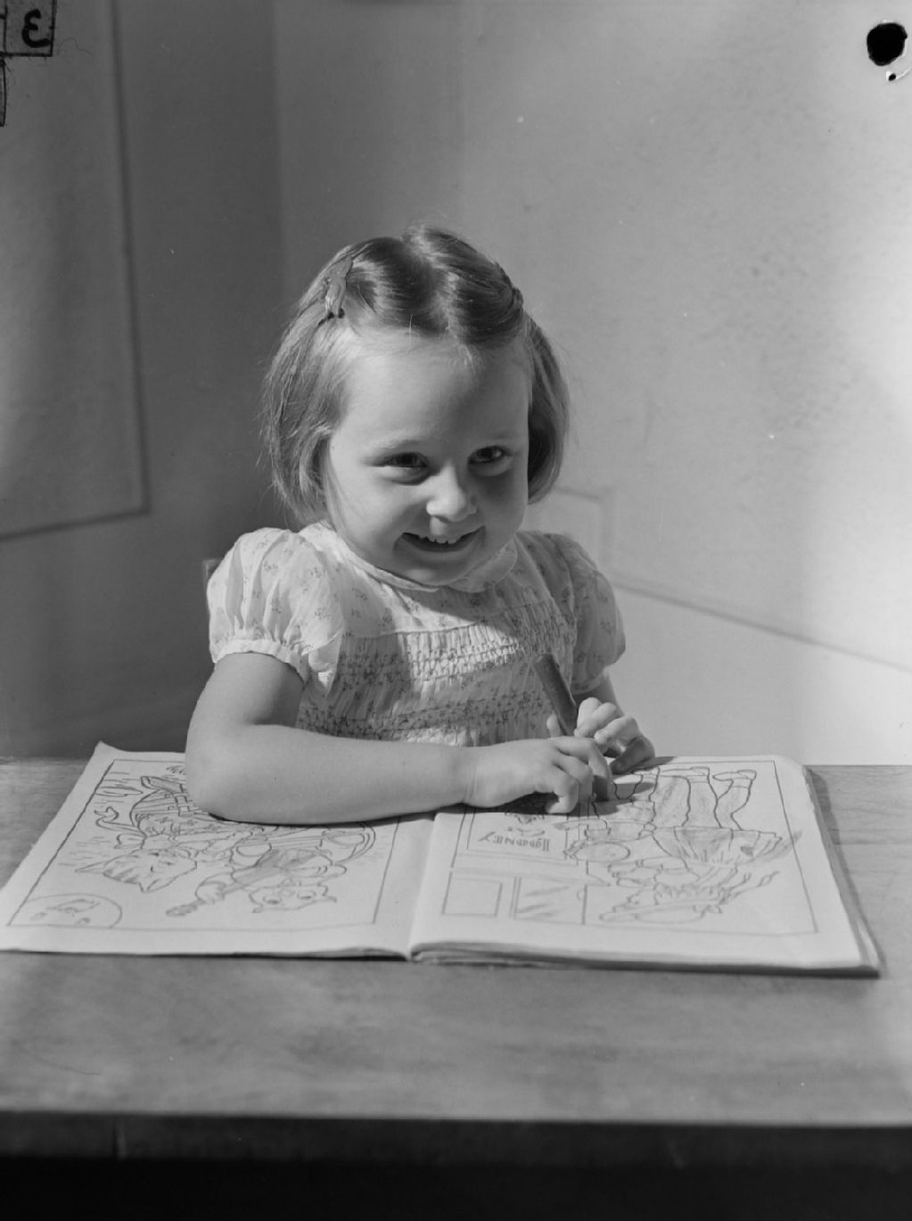 La petite Hodge colorie dans un cahier à colorier avec un crayon de couleur