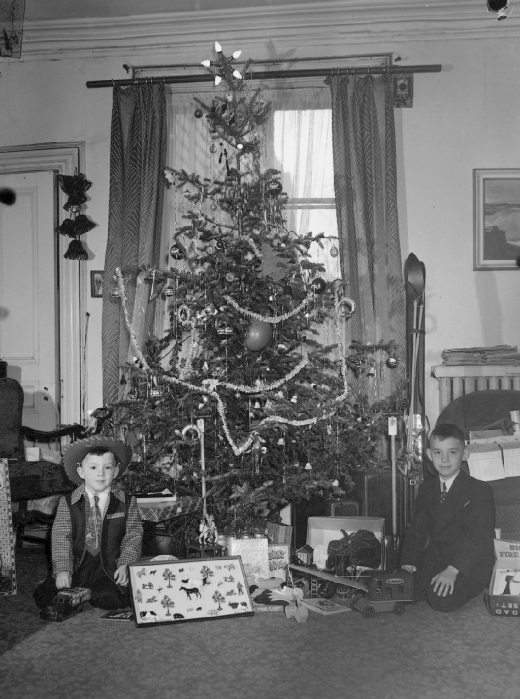 Les deux fils de madame M. Barlow sont assis près de l'arbre de Noël sous lequel se trouvent les cadeaux. Un des garçons porte un costume de cow-boy