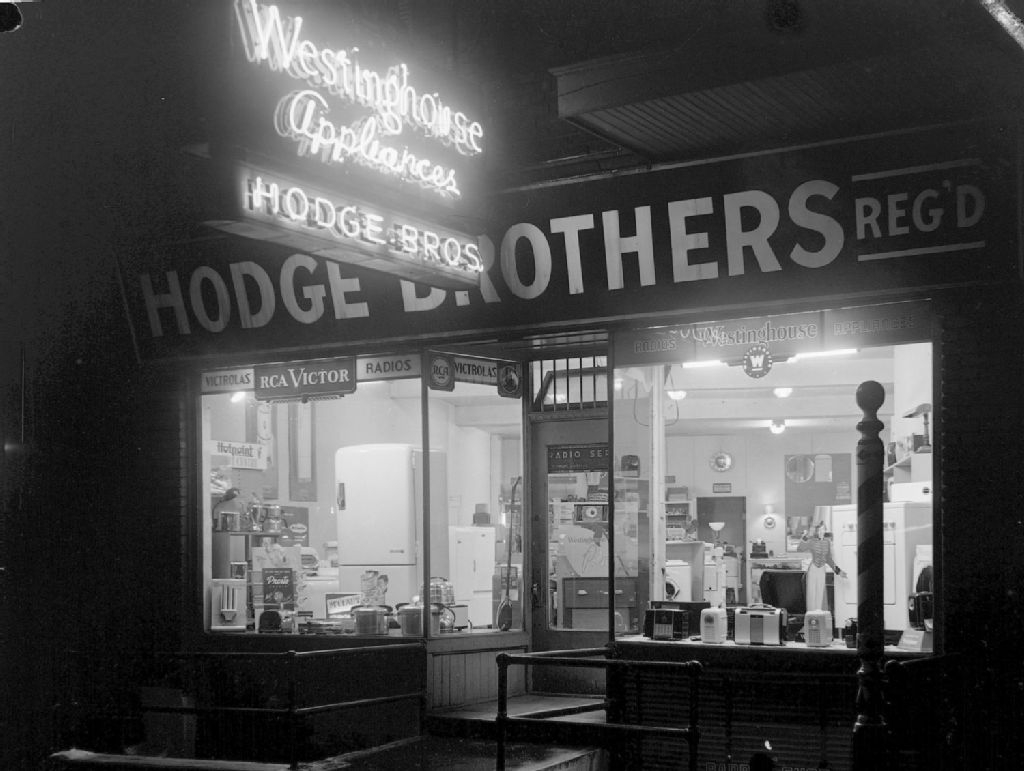 Nous voyons la vitrine du magasin d'appareils électriques Westinghouse «Hodge Brothers Reg'd»