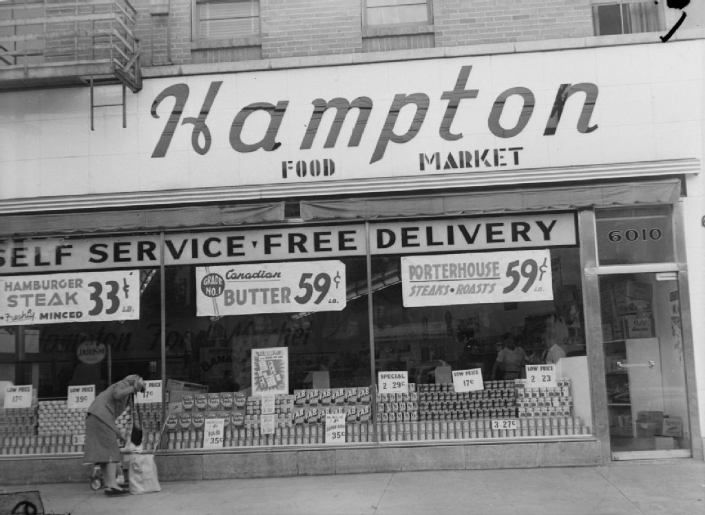 Nous voyons la vitrine de l'épicerie «Hampton Food Market» située rue Sherbrooke Ouest à Montréal