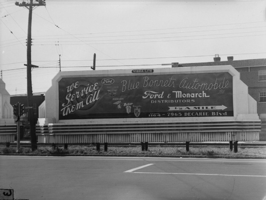 Nous voyons le panneau publicitaire annonçant le commerce «Blue Bonnets Automobile» du boulevard Décarie à Montréal, concessionnaire de voitures Ford et Monarch
