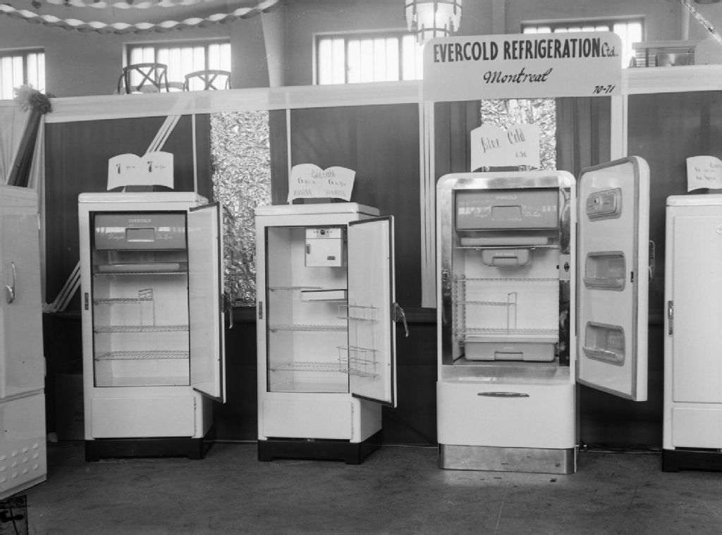 Nous voyons trois réfrigérateurs de marque «Evercold» dans le stand de «Evercold Refrigeration Ltd» du boulevard Décarie à Montréal