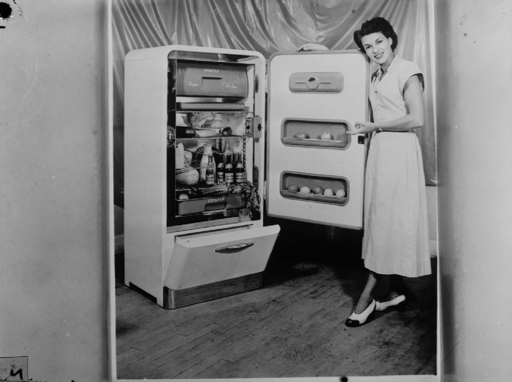 Une dame se tient devant la porte ouverte d'un réfrigérateur «Evercold» rempli de nourriture