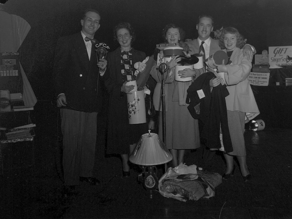 Trois dames, entre deux animateurs dont un au microphone de CFCF, ont gagné plusieurs objets à l'exposition de nouvelle marchandise d'automne organisée par l'Association des hommes d'affaires de Notre-Dame-de-Grâce