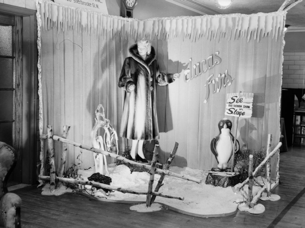 Nous voyons le stand du magasin de fourrures «Ducas Bros. Furriers Inc.» de la rue Sherbrooke Ouest à Montréal. Ce stand fait partie de l'exposition de nouvelle marchandise d'automne organisée par l'Association des hommes d'affaires de Notre-Dame-de-Grâce