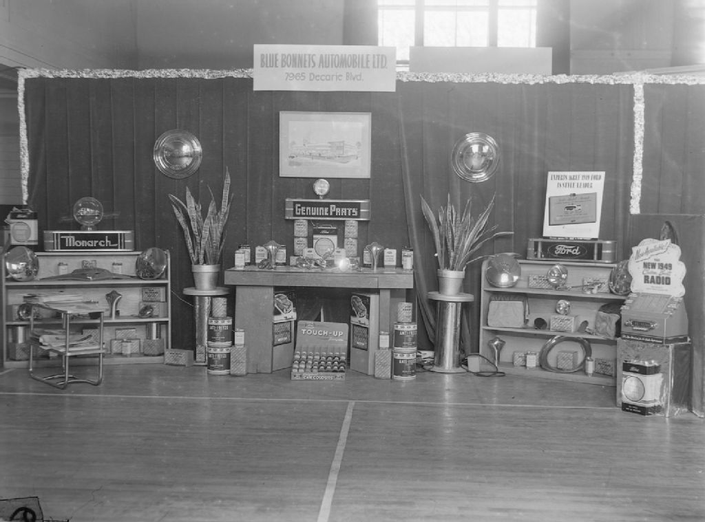 Nous voyons les pièces d'autos et les produits d'entretien à vendre chez «Blue Bonnets Automobile» du boulevard Décarie à Montréal, concessionnaire de voitures Ford et Monarch. Ce stand fait partie de l'exposition de nouvelle marchandise d'automne organisée par l'Association des hommes d'affaires de Notre-Dame-de-Grâce