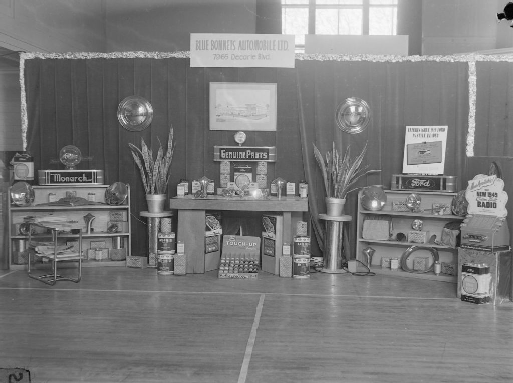 Nous voyons les pièces d'autos et les produits d'entretien à vendre chez «Blue Bonnets Automobile» du boulevard Décarie à Montréal, concessionnaire de voitures Ford et Monarch. Ce stand fait partie de l'exposition de nouvelle marchandise d'automne organisée par l'Association des hommes d'affaires de Notre-Dame-de-Grâce