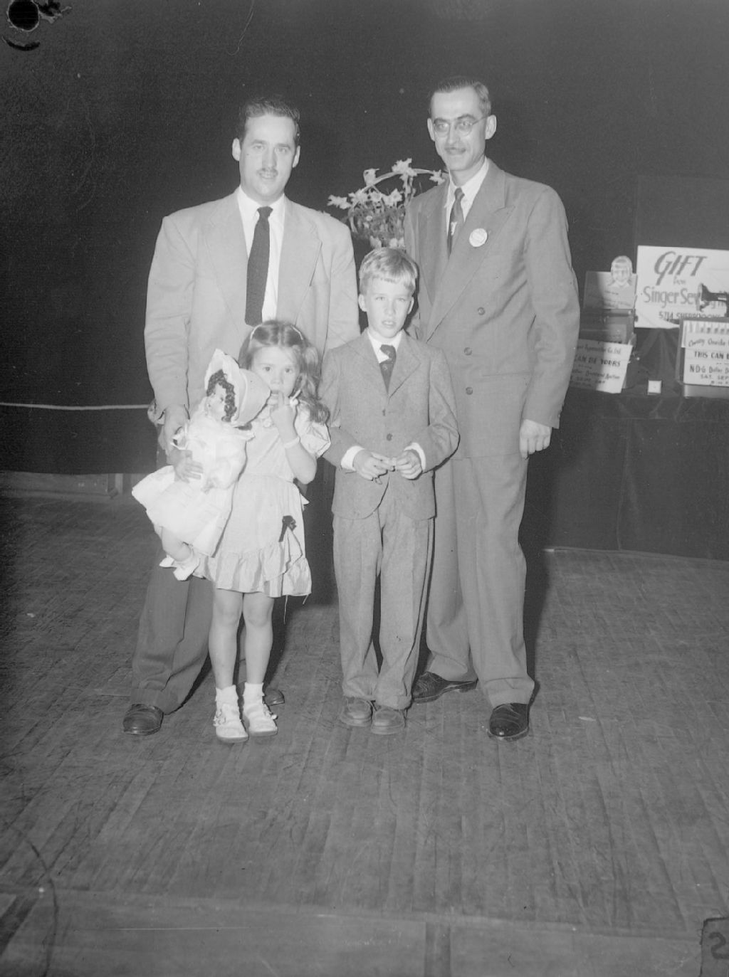 Deux enfants, entourés de deux animateurs, ont reçu des jouets de l'encan «Dollar Dividend Auction» de l'exposition de nouvelle marchandise d'automne organisée par l'Association des hommes d'affaires de Notre-Dame-de-Grâce