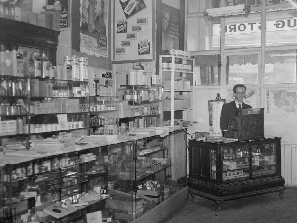 Nous voyons un employé derrière le comptoir de la pharmacie S. Boulkind située au 1469, boulevard Saint-Laurent à Montréal