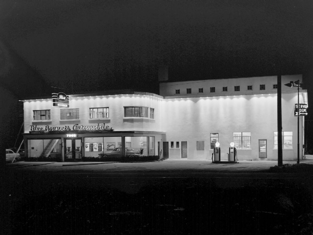 Nous voyons le commerce «Blue Bonnets Automobile» du boulevard Décarie à Montréal, concessionnaire de voitures Ford et Monarch