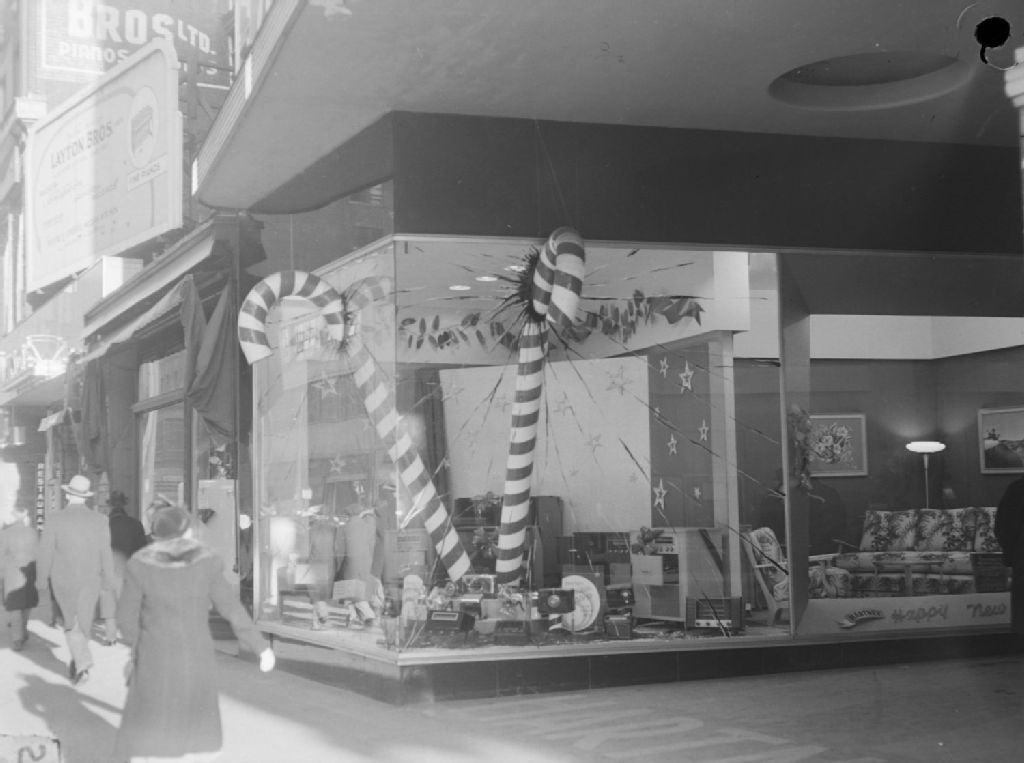 Nous voyons la vitrine, décorée de grosses cannes de Noël, du magasin de meubles, radios et appareils ménagers «Hartney Co Ltd» de la rue Sainte-Catherine Ouest à Montréal