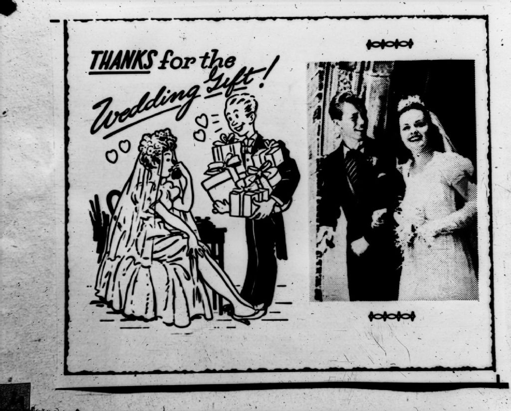 Nous voyons un dessin et une photographie d'une carte de remerciements pour un cadeau de mariage