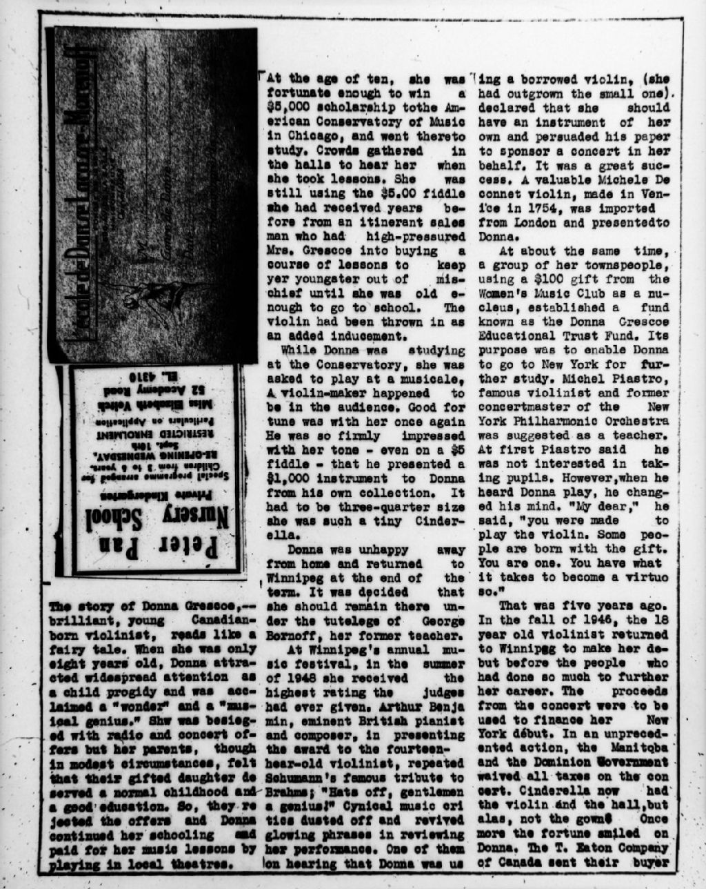 Nous voyons un extrait de texte sur la violoniste Donna Grescoe publié dans un numéro de «Cavalcade», l'annonce publicitaire de la maternelle Peter Pan, située chemin Academy à Westmount et la carte professionnelle de l'école de danse Lacasse-Morenoff de l'avenue de LaSalle à Montréal