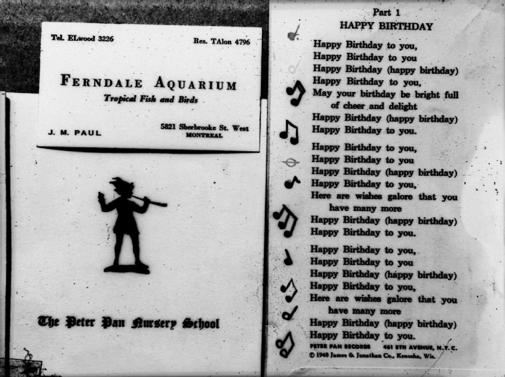 Nous voyons la carte professionnelle de J. M. Paul de Ferndale Aquarium situé rue Sherbrooke Ouest à Montréal. Nous avons aussi le texte de «Happy Birthday» et le dessin de la maternelle Peter Pan, située chemin Academy à Westmount