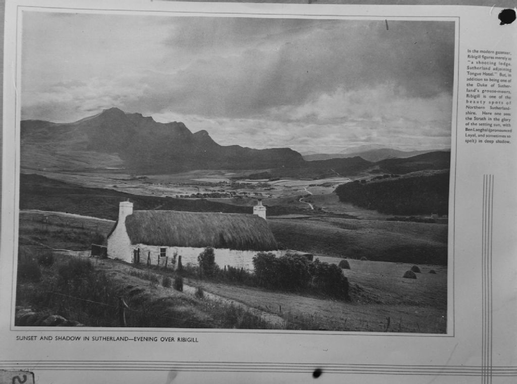 Nous voyons la photographie d'une toile représentant un paysage écossais intitulée «Sunset and Shadow in Sutherland-Evening over Ribigill»