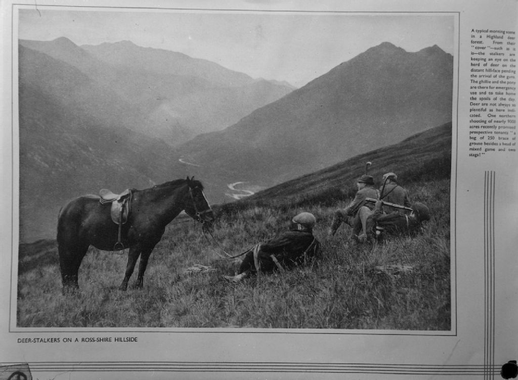 Nous voyons la photographie d'une toile représentant des chasseurs et un cheval intitulée «Deer-Stalkers on a Ross-Shire Hillside»