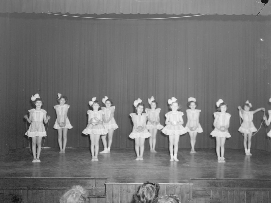 Des jeunes filles suivent des cours de ballet à la Mount Royal School, située rue Saint-Urbain à Montréal. Elles présentent une chorégraphie dans laquelle elles tiennent un ballon ou une corde à sauter