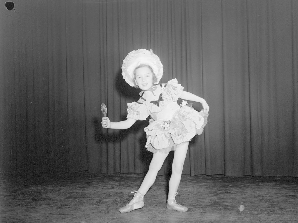Une petite fille suit des cours de ballet à la Mount Royal School, située rue Saint-Urbain à Montréal. Coiffée d'un chapeau, elle se regarde dans le petit miroir qu'elle tient