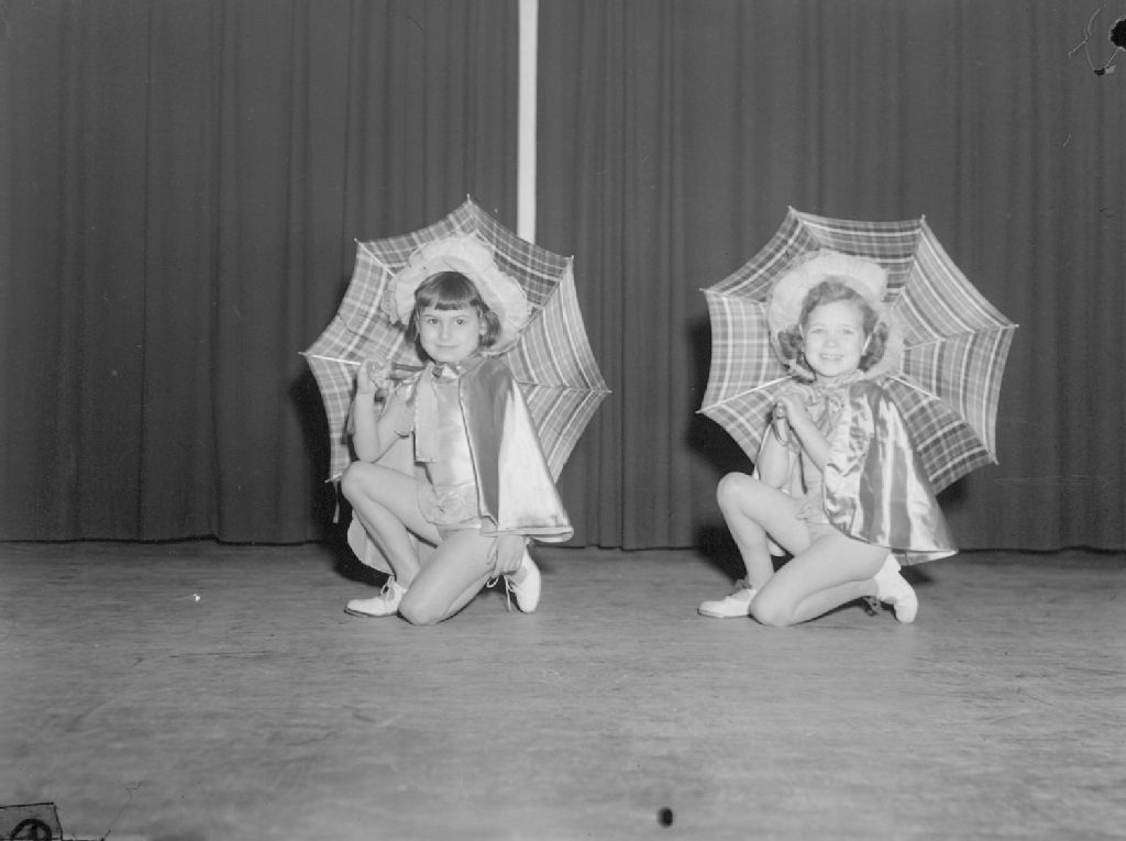 Deux fillettes suivent des cours de ballet à la Mount Royal School, située rue Saint-Urbain à Montréal. Elles portent une cape, sont coiffées d'un chapeau et tiennent un parapluie pour présenter leur chorégraphie