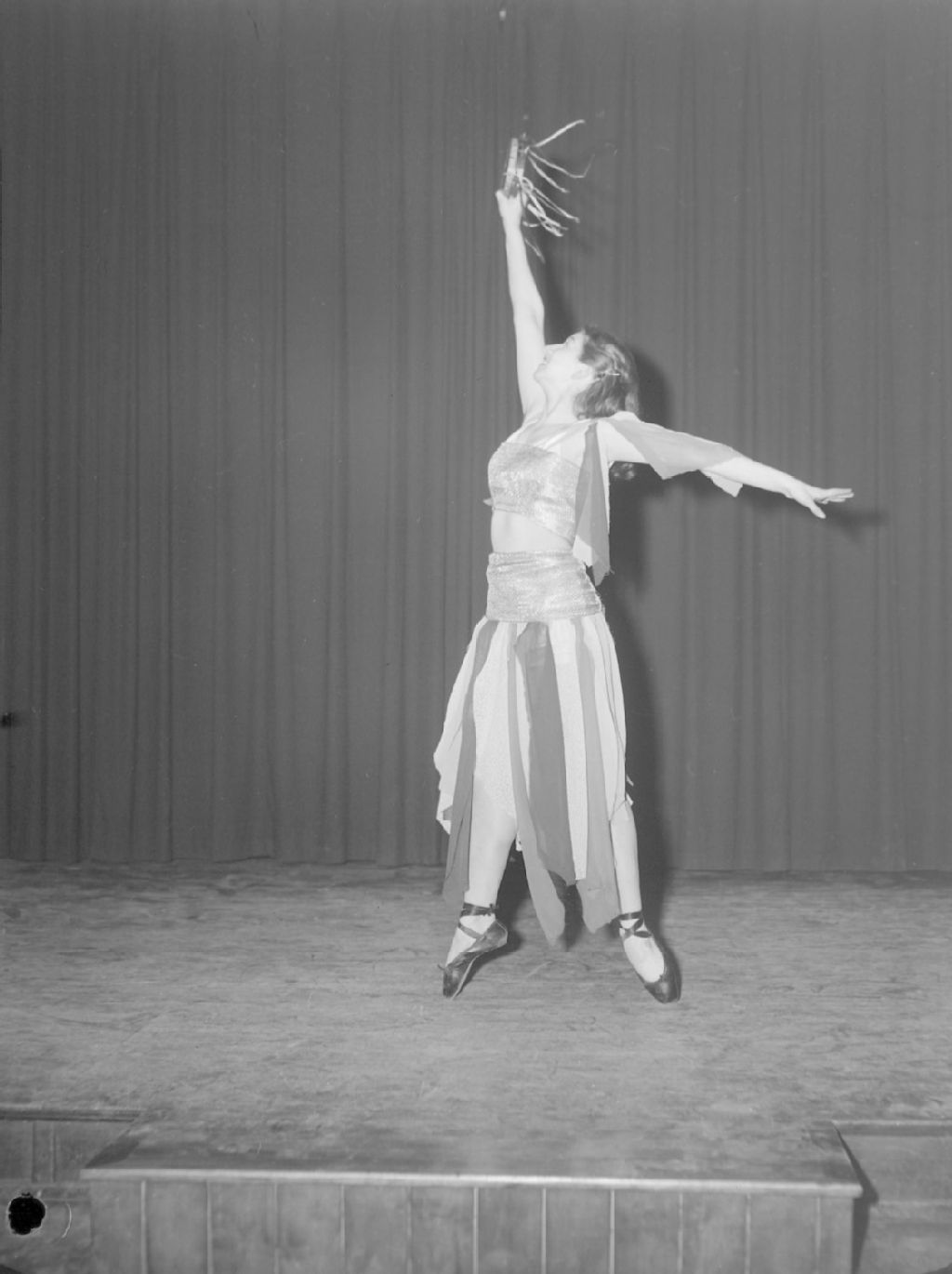 Une jeune fille suit des cours de ballet à la Mount Royal School, située rue Saint-Urbain à Montréal. Elle se tient sur les pointes et joue avec un tambour de basque
