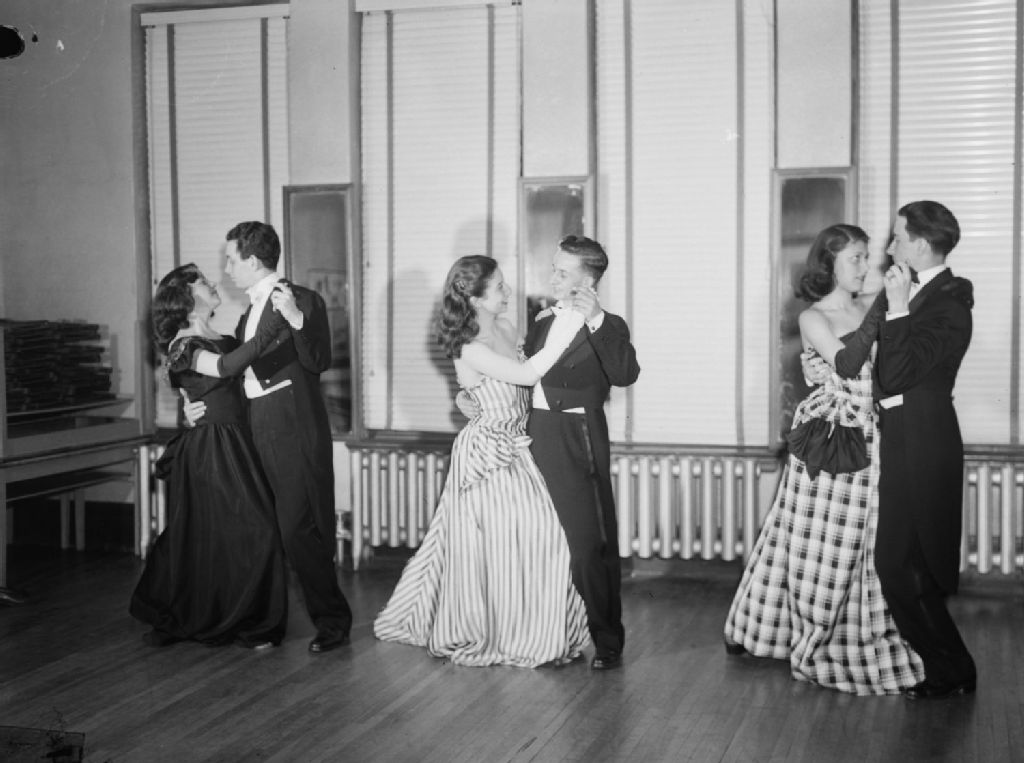 Trois couples, en tenue de soirée, suivent des cours de danse au Park Dance Studio de l'avenue Van Horne à Outremont