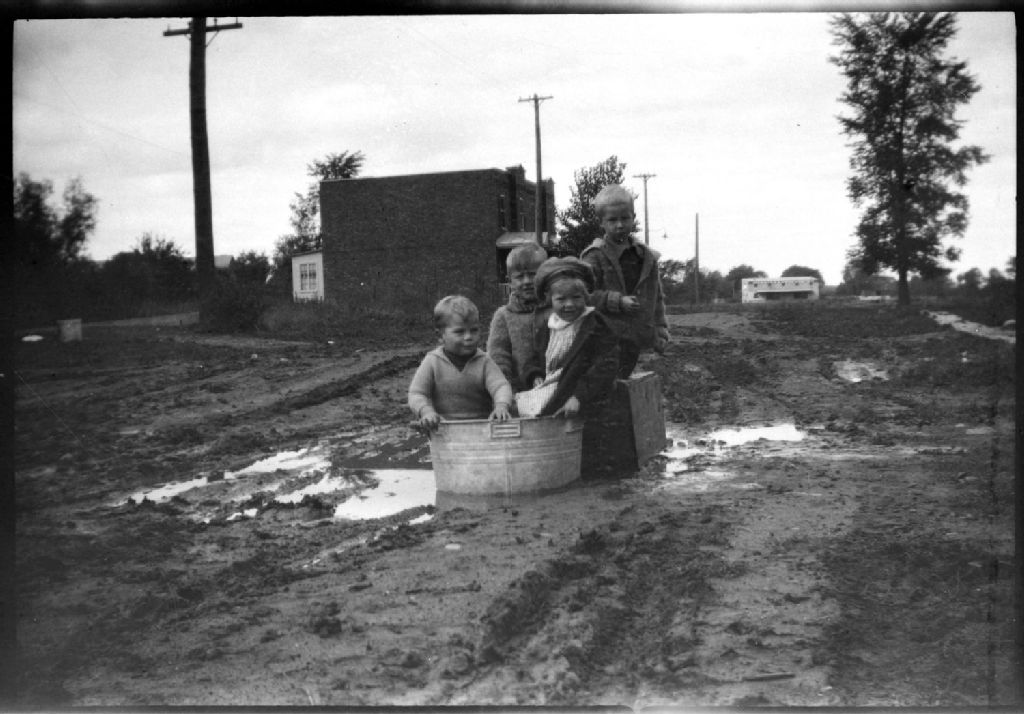 Les enfants Evelyn et Buddy Kimber ainsi que les enfants Preston entassés dans un bassin de métal sur un terrain vague situé sur la rue Connaught à Montréal-Ouest
