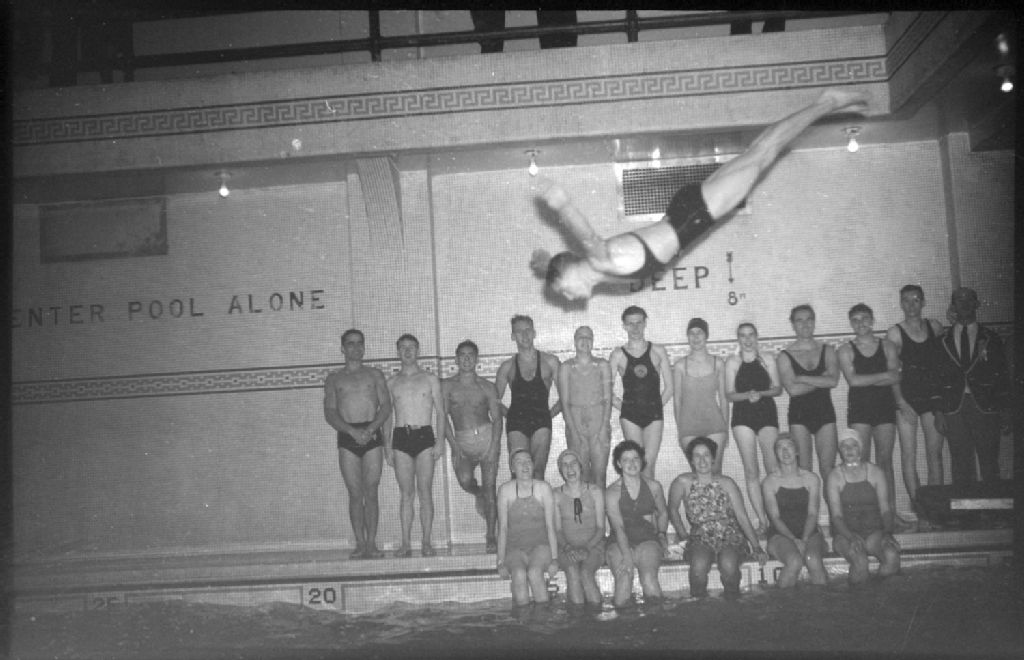 Nous voyons un baigneur (G.E. Gladwell) exécutant un plongeon lors d'une fête à la piscine du YWCA à Montréal. Nous apercevons une foule de participants en maillot, assis ou debout sur le bord de la piscine, observant la scène