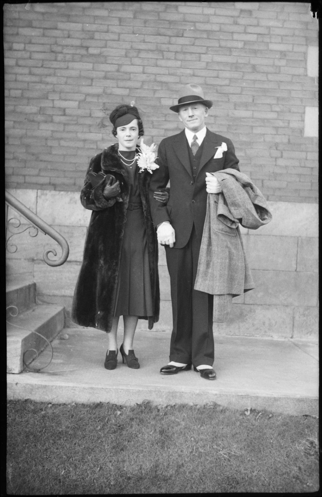 Nous voyons un couple posant devant un immeuble lors d'une célébration, l'homme en complet et la femme en manteau de fourrure avec un bouquet de corsage