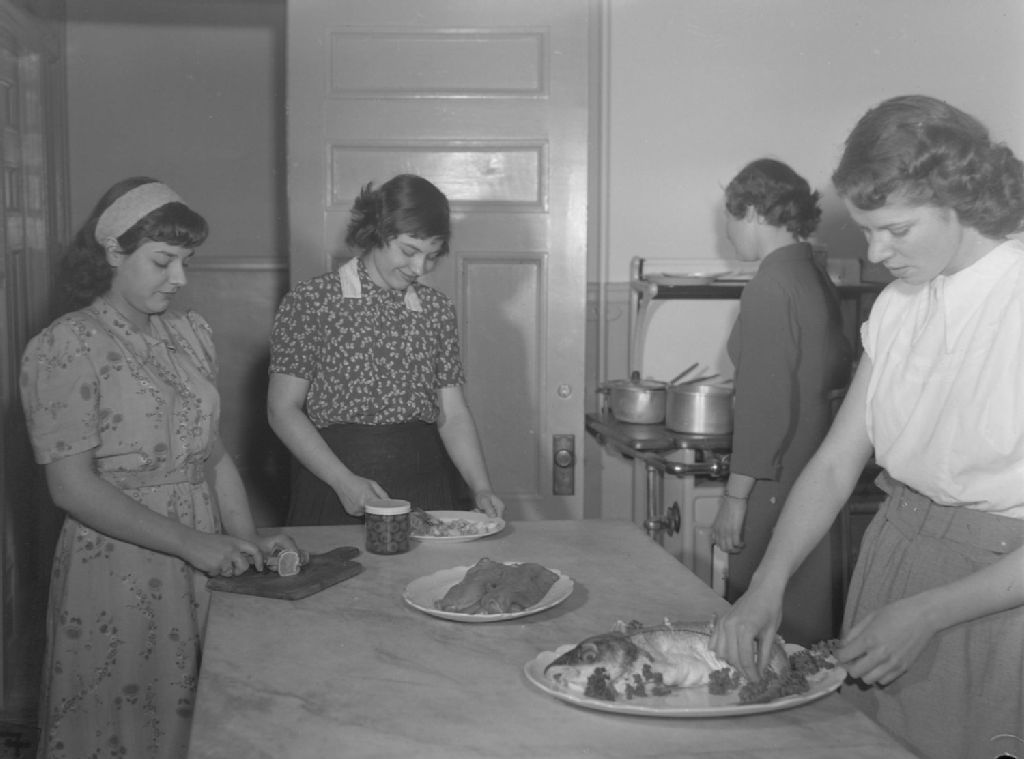 Lise Girard, Pierrette Malbeuf, Rachel Perrault et Suzanne Beaudry font de la cuisine. Elles étudient à l'École des arts et métiers de Maisonneuve située rue Hochelaga à Montréal