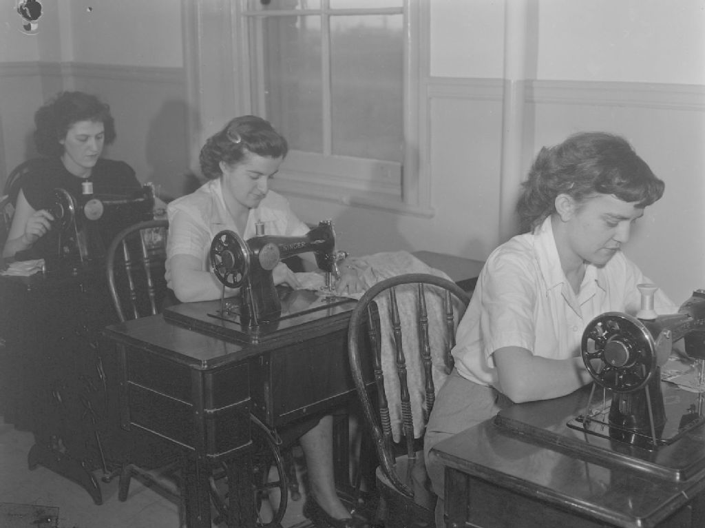 Huguette Hurtubise, Pauline Beaudry et Paule Emile Drapeau cousent à la machine à coudre Singer. Elles étudient à l'École des arts et métiers de Maisonneuve située rue Hochelaga à Montréal