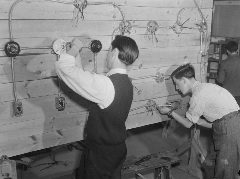Gilles Tremblay et Jacques Vincent posent des prises de courant et des douilles de plafonnier. Ils suivent des cours d'électricien à l'École des arts et métiers de Maisonneuve située rue Hochelaga à Montréal