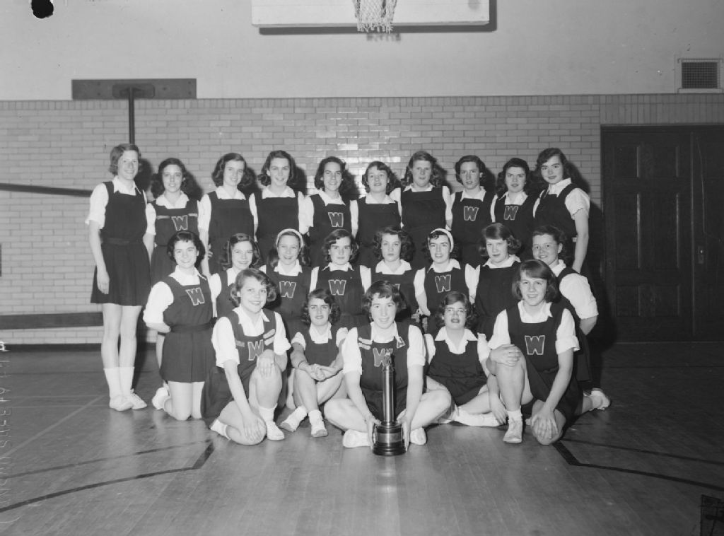Nous voyons les filles de l'équipe de lancer du poids de la Westmount Junior High School. Elles ont gagné un trophée