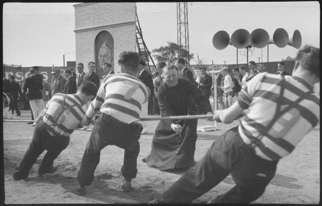 Lors du festival des Écoles catholiques de Montréal au stade Delorimier, nous voyons trois hommes souquant ou participant à une épreuve de force à la corde, encouragé par un prêtre en soutane. Nous voyons l'effigie de Louis Joseph Papineau à l'arrière-plan