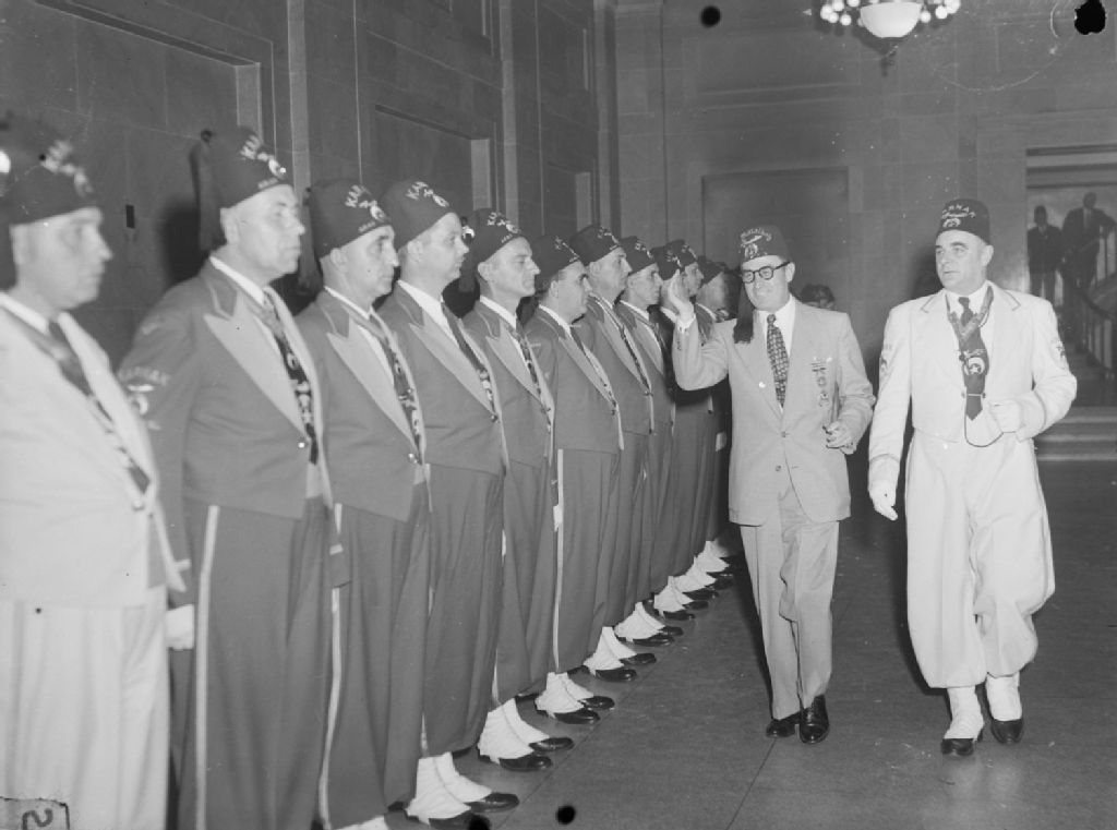Harold Lloyd fait la revue de la patrouille arabe du Karnak Temple Mystic Shrine situé rue Sherbrooke Ouest à Montréal. Ils sont coiffés de fez sur lesquels sont représentés un sabre, un croissant et une étoile
