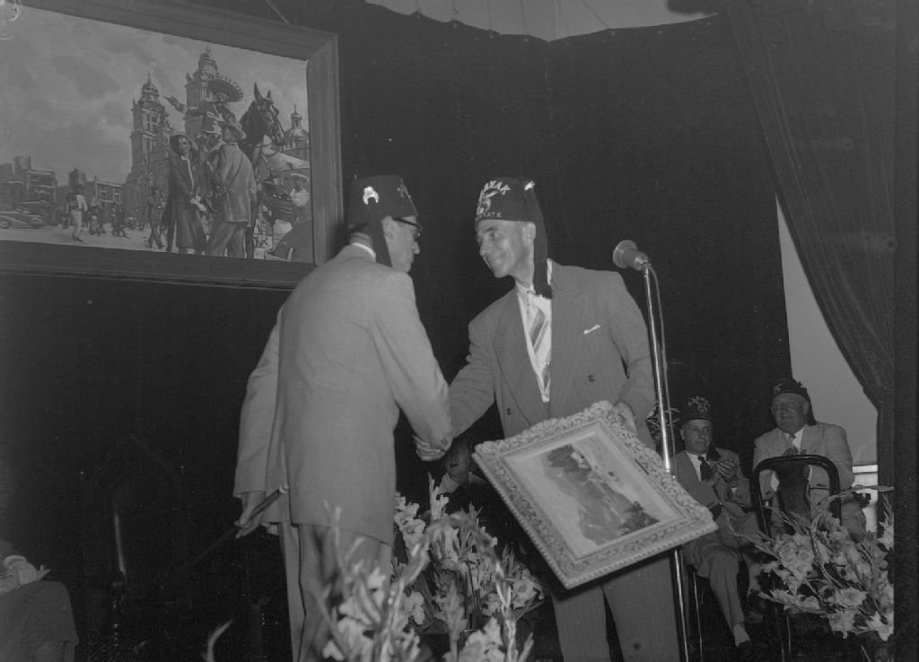 Harold Lloyd reçoit une peinture en cadeau. Le mot «potentate» est inscrit sur le fez du présentateur et H. Lloyd a le mot «Malaikah» d'inscrit sur le sien