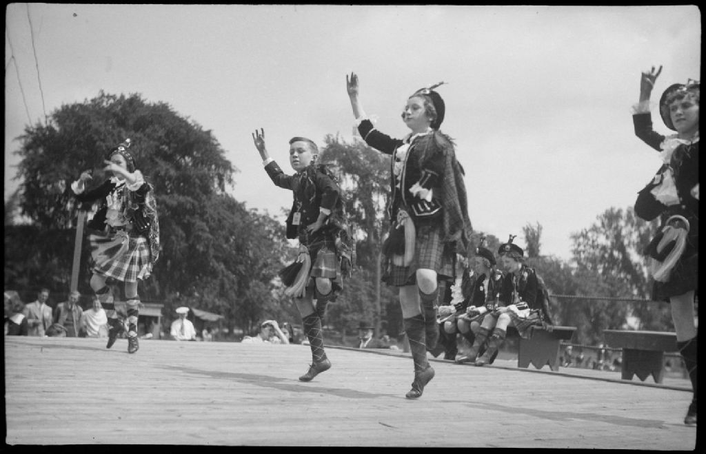 Lors de compétitions sportives écossaises, «The Caledonian Games» à Montréal, nous apercevons sur une estrade trois danseuses et un danseur en kilt traditionnel exécutant une danse folklorique devant le public